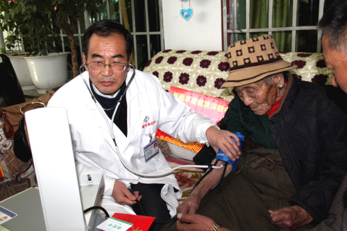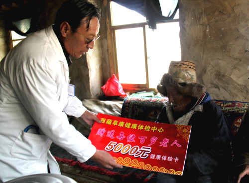 西藏高寒缺氧,自然環(huán)境惡劣,60多年前,這里的人均壽命才35.5歲。然而60多年后,2012年拉薩市所有七縣一區(qū)百歲老人就有16位,這些走過兩個世紀(jì)的百歲老人,見證了西藏翻天覆地的滄桑巨變,他們是全社會的寶貴財富,更是西藏從貧窮走向繁榮富強的親歷者、見證者。在全國人民喜迎黨的十八大勝利召開之際,西藏阜康(國際)體檢中心與拉薩市民政局老齡辦組織發(fā)起了“關(guān)愛百歲老人行動”。我們歷時16天,里程2000多公里,尋訪了拉薩七縣一區(qū)十一位百歲老人,我們不僅為每位老人送上了精心準(zhǔn)備的三千元現(xiàn)金、五千元健康體檢卡、一個便攜式氧氣瓶、一個便攜式血壓儀,還為他們送上了免費義診和相關(guān)藥品。王斌董事長參加了此項活動的啟動儀式,嘎布院長、張德才院長親自帶隊為每一位百歲老人做了常規(guī)的身體檢查,并送上了藥品和祝福。