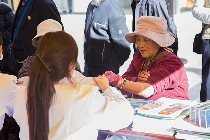 自14日早上九點(diǎn)活動開始,前來阜康醫(yī)藥義診宣傳點(diǎn)測血壓、測血糖、咨詢身體健康問題及安全用藥知識的人便絡(luò)繹不絕,整整一上午,阜康醫(yī)藥16名醫(yī)護(hù)人員都在一刻不停的忙前忙后,但能夠?yàn)閺V大藏族同胞及社會群眾服務(wù),大家都絲毫不覺得辛苦,反而發(fā)自內(nèi)心的感到充實(shí)與喜悅。據(jù)活動結(jié)束后統(tǒng)計(jì),本次活動西藏阜康醫(yī)藥發(fā)展有限公司免費(fèi)發(fā)放各類相關(guān)資料千余份,免費(fèi)發(fā)放維生素、鈣片、風(fēng)濕及心腦類等藥品一萬兩千余元,免費(fèi)測血壓、血糖、看病等也多達(dá)數(shù)百人次。