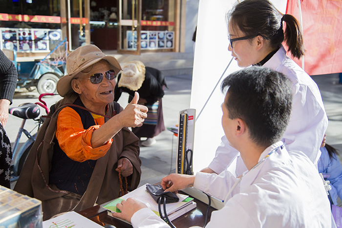 在活動期間,前來阜康醫(yī)藥義診宣傳點(diǎn)的藏族同胞及社會群眾紛紛表達(dá)了自己對阜康醫(yī)藥全體員工的感謝,一位年齡較大的藏族老伯前來測量完血壓并咨詢了一些自己身體健康方面的問題之后,更是再三對阜康醫(yī)藥的醫(yī)護(hù)人員表達(dá)了謝意,并且毫不吝嗇贊美之情地對我們豎起了大拇指!西藏自治區(qū)德吉副主席等幾位領(lǐng)導(dǎo)在本次活動巡查工作中,于阜康醫(yī)藥免費(fèi)義診宣傳點(diǎn)與我院醫(yī)護(hù)人員等進(jìn)行了交流,并再次表達(dá)了對阜康醫(yī)藥長期以來積極參與各項(xiàng)活動、傾情奉獻(xiàn)社會民族、熱心回饋西藏百姓的誠摯的感謝。