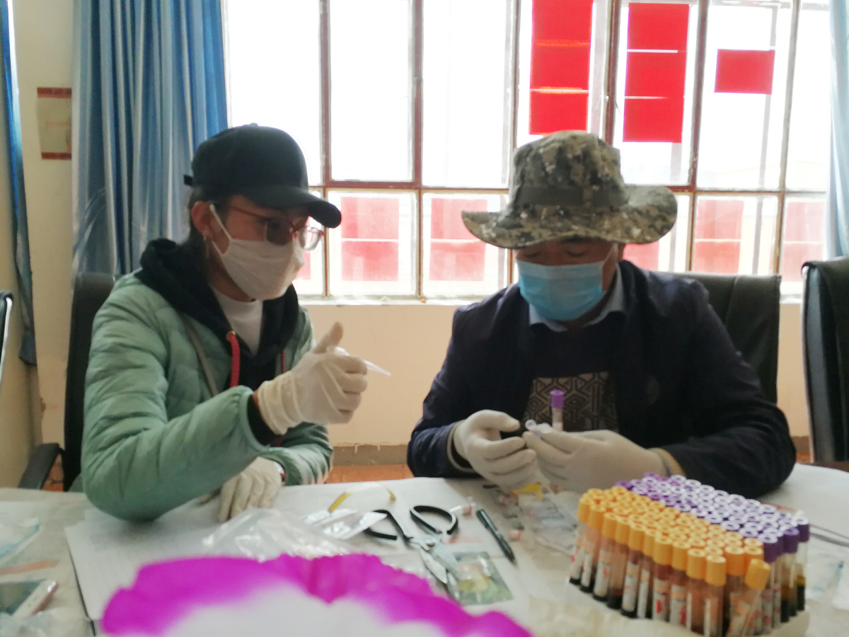 鐘義華、劉亞美、丁雪琴分到另一組,負責(zé)采血和血樣信息錄入工作。鐘義華是檢驗士也是隊長,更是我們醫(yī)療隊唯一的男孩子,重活、粗活全包,還要負責(zé)隊員的工作安排,以及與政府領(lǐng)導(dǎo)、工作人員的溝通協(xié)調(diào),除此之外,他還要負責(zé)血樣采集、包蟲病防治的宣傳。