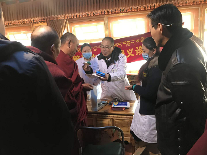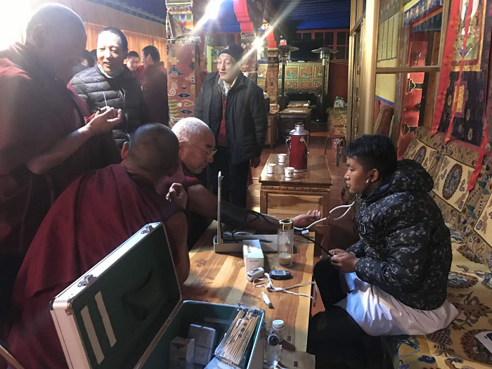 由于當天寺廟在進行法會活動,有部分僧侶沒有到場。義診隊共計為200多名僧侶進行了體檢,期間得到了羅布次仁處長、索次主任的大力支持與幫助。在離開寺廟時,羅布次仁處長握著田豐輝醫(yī)生的手深切地說:“你們辛苦了!”其言雖短,但至真至切。