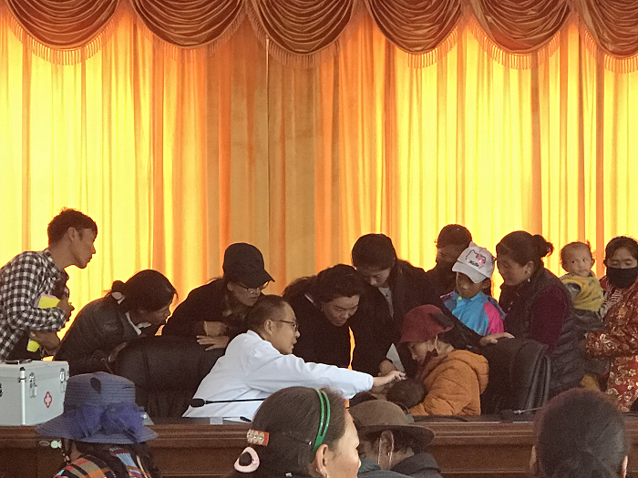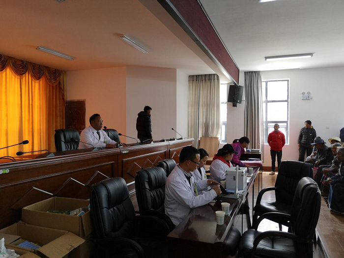 隨后,阜康義診隊(duì)對(duì)前來(lái)咨詢和檢查的牧民做了詳細(xì)的解答和初步的身體檢查。周健主治醫(yī)師負(fù)責(zé)測(cè)量血壓、了解老百姓的基本健康情況,唐宗青護(hù)士負(fù)責(zé)給牧民測(cè)血糖,瓊瑪副主任醫(yī)師和榮瑪鄉(xiāng)高海拔生態(tài)搬遷點(diǎn)醫(yī)務(wù)室的同志負(fù)責(zé)給老百姓發(fā)放藥品,工作在有條不紊中進(jìn)行。