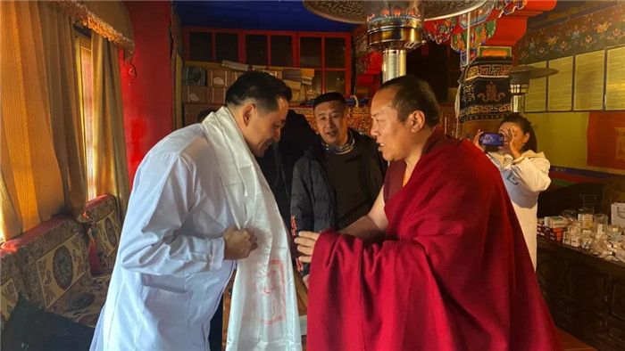義診結束后,甘丹寺經(jīng)師阿旺曲帕為義診組每位成員獻上哈達,以表達對阜康醫(yī)院的感激之情。