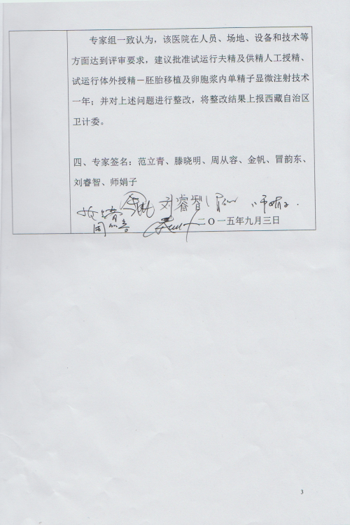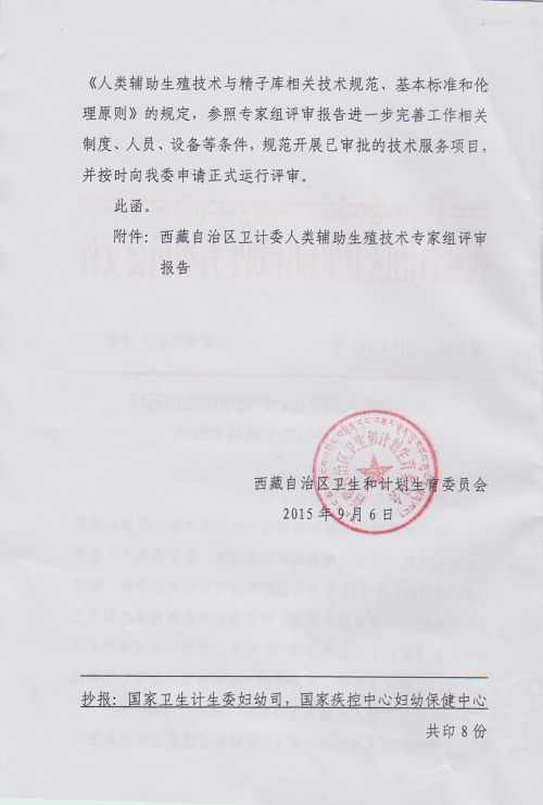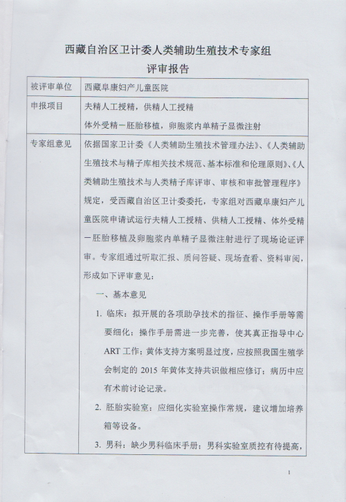 你公司提交的開展人類輔助生殖技術(shù)申請,經(jīng)錄入國家輔助生殖技術(shù)管理信息審核通過后,系統(tǒng)遴選了7名專家,于2015年9月3日到拉薩市進(jìn)行實地審核評審。按照專家組提交的評審報告意見,同意你公司在西藏阜康婦產(chǎn)兒童醫(yī)院(拉薩市羅布林卡路18號),試運行開展精子人工受精、供精人工受精、體外受精-胚胎移植、卵胞漿內(nèi)單精子顯微注射四種人類輔助生殖技術(shù),試運行時間一年。