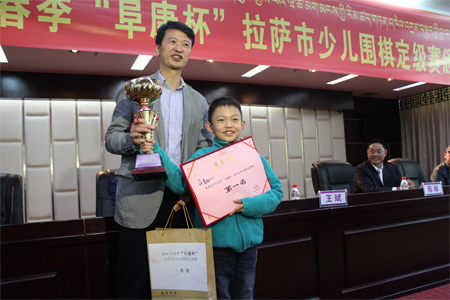 3月25日比賽結(jié)束后“復(fù)康杯”少兒圍棋定級(jí)賽頒獎(jiǎng)儀式開始,拉薩棋院院長(zhǎng)王斌、西藏阜康醫(yī)藥發(fā)展有限公司總經(jīng)理劉瀟瀟、西藏阜康醫(yī)藥發(fā)展有限公司總經(jīng)理陳彬、拉薩棋院圍棋部副主任趙鈞以及棋院老師陳學(xué)滸、袁文琴出席了本次會(huì)議。 王斌院長(zhǎng)在頒獎(jiǎng)儀式表示,很高興能夠舉辦拉薩市首屆“阜康杯”少兒圍棋定級(jí)賽,他向比賽獲勝者表示衷心的祝賀,希望他們能再接再厲繼續(xù)學(xué)習(xí)圍棋。他了解到很多家長(zhǎng)對(duì)拉薩市棋院選址郵政賓館非常滿意,這里環(huán)境清幽,非常適合教學(xué),他當(dāng)場(chǎng)表示郵政賓館二樓已經(jīng)被棋院斥資180萬元租賃6年,至少在6年以內(nèi)棋院不會(huì)從新選址。王斌表示,目前,拉薩棋院正在向上級(jí)有關(guān)部門申請(qǐng)圍棋段位資格證的相關(guān)事宜,如無意外,預(yù)計(jì)在今年年底能夠申請(qǐng)成功,完成圍棋段位資格證的申請(qǐng),不僅能給我區(qū)圍棋事業(yè)的發(fā)展帶來很大的幫助同時(shí)也能讓我區(qū)更多的圍棋愛好者參與到此次項(xiàng)目。