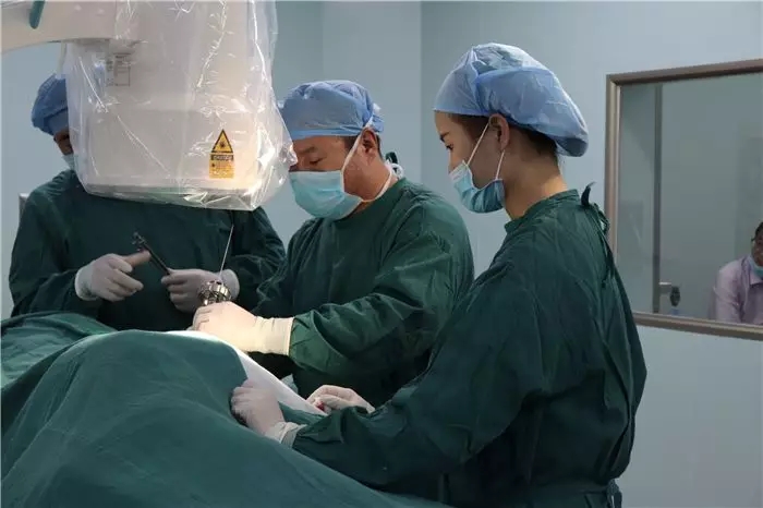 13:00時(shí),徐鑫一行來(lái)到病房,對(duì)即將接受手術(shù)的患者進(jìn)行術(shù)前評(píng)估,看過(guò)核磁共振和CT檢查資料,通過(guò)交流討論最終確定了手術(shù)方案。13:35分患者被推進(jìn)手術(shù)室,本次手術(shù)由徐鑫和阜康醫(yī)院骨科醫(yī)師李延軍共同完成。手術(shù)運(yùn)用BEIS技術(shù),在定位階段專(zhuān)家們多次透視確保儀器直達(dá)患處,以確保摘除髓核準(zhǔn)確無(wú)誤、減少患者創(chuàng)傷。髓核摘除后,患者疼痛麻木感隨即消失,手術(shù)圓滿(mǎn)成功,16:25分患者被推出手術(shù)室,專(zhuān)家嚴(yán)謹(jǐn)細(xì)致的作風(fēng)以及精湛的技術(shù)贏得醫(yī)務(wù)人員的掌聲。椎間孔鏡微創(chuàng)手術(shù)的重點(diǎn)在于透視定位,只有精準(zhǔn)定位才能保證準(zhǔn)確摘除髓核,減少患者疼痛與創(chuàng)傷。