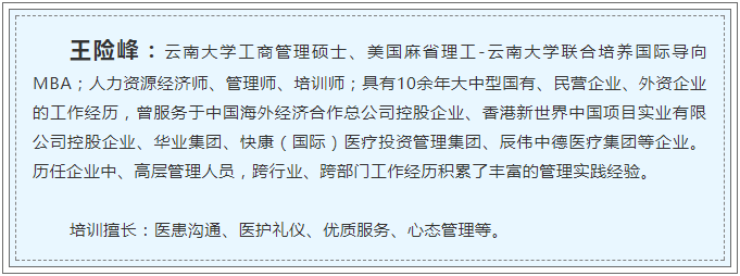 王險峰以“為什么來培訓(xùn)”開題,對本次培訓(xùn)的目的與意義進行了說明,調(diào)動了在場員工學(xué)習(xí)積極性。接下來他對“規(guī)范醫(yī)療”、“安全醫(yī)療”、“效率醫(yī)療”、“溫度醫(yī)療”四種醫(yī)療模式進行區(qū)別解讀,以加深員工對“優(yōu)質(zhì)醫(yī)療服務(wù)”的理解。王險峰介紹,北京市朝陽區(qū)桓心腫瘤醫(yī)院院長丁劍曾說“無溫度,不醫(yī)療。溫度醫(yī)療是整個非公醫(yī)療行業(yè)的出路”,阜康作為民營醫(yī)療機構(gòu),開展“溫度醫(yī)療”,提供“優(yōu)質(zhì)服務(wù)”是發(fā)展壯大的重要途徑。接下來他就如何營造“溫度醫(yī)療”進行展開論述,分別從“什么是服務(wù)和優(yōu)質(zhì)服務(wù)”、“職業(yè)化態(tài)度與服務(wù)能力”、“與患者家屬建立良好關(guān)系”、“語言和非語言能力及傾聽能力”、“談判技巧與化解沖突能力”、“禮儀行為規(guī)范”六個方面進行闡釋。