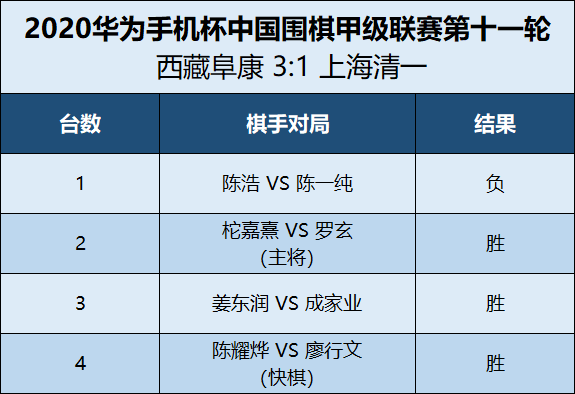 12月8日,2020華為手機(jī)杯圍棋甲級(jí)聯(lián)賽在成都武侯進(jìn)行第11輪的比拼,西藏阜康隊(duì)對(duì)陣上海清一隊(duì)。十輪戰(zhàn)罷,西藏阜康隊(duì)以2:2主將勝江西金達(dá)萊環(huán)保隊(duì),排名第八。