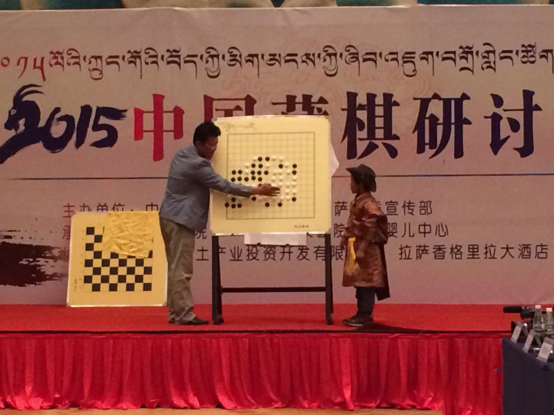 11月7日上午10時(shí)30分,2015中國(guó)藏棋研討會(huì)在香格里拉大酒店1號(hào)宴會(huì)廳開幕,阿旺邊巴老師現(xiàn)場(chǎng)講解藏棋歷史沿革、發(fā)展分布概況及藏式圍棋(密芒)、久、國(guó)王與大臣等藏棋介紹。并與現(xiàn)場(chǎng)人員互動(dòng)演繹“國(guó)王與大臣棋”、“魚棋”等。