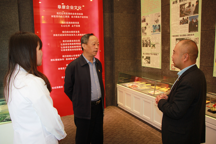 在阜康醫(yī)院五樓院史館,劉連福向劉家杰一行介紹了阜康醫(yī)療不平凡的發(fā)展歷程以及阜康人在黨的建設(shè)、抗震救災(zāi)、公益事業(yè)、企業(yè)文化等方面的成就,劉家杰一行對阜康醫(yī)療各方面的工作表示充分認(rèn)可并對“阜康”中所含的物阜民康——“物產(chǎn)豐富,民族安康”之意表現(xiàn)出極大的興趣,希望通過阜康人在醫(yī)藥領(lǐng)域的不懈努力,勇于攀登醫(yī)學(xué)高峰,為西藏的醫(yī)療發(fā)展貢獻力量。