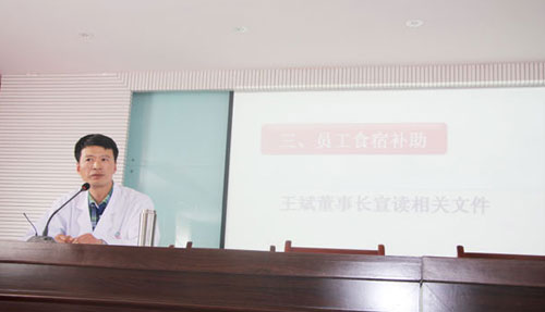 在談到員工食宿補助時,王斌董事長宣讀了相關(guān)文件,并就一些問題做出了解釋:員工的食堂補助由原來的四百元上漲到五百元;從六月份起,由三家醫(yī)院拿出部分收入補貼員工住宿,如此住宿補貼由原來的一百四十元上漲到二百四十元。以此來提高全體員工的食宿質(zhì)量,并以此來保證低收入者不為一日三餐所發(fā)愁,減輕低收入者們的生活壓力。為此,王斌董事長還要求綜合辦公室下發(fā)文件,要求食堂提高飯菜質(zhì)量,保證員工吃上品種多樣且營養(yǎng)又衛(wèi)生的飯菜。對此,張德才院長發(fā)表了自己的一些看法,也談了關(guān)于食堂的一些改革,并對王斌董事長的這項決議表示了大力支持。