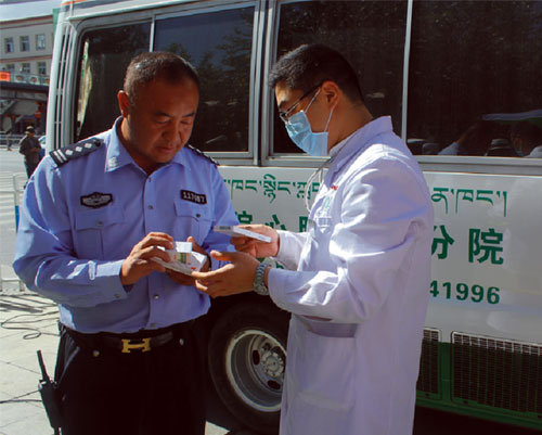 2014年6月1日上午,西藏阜康(國(guó)際)健康體檢中心派出免費(fèi)體檢車(chē),為拉薩市公安局交警隊(duì)東西南北郊的執(zhí)勤民警們及女子中隊(duì)做了免費(fèi)體檢。