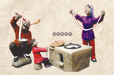 這做面條的功夫在那揉面的一關(guān),沒有揉到的面,見了開水馬上就成了塊狀,再經(jīng)水一煮,出來就是稀糊糊了。所以,這個(gè)面條的長短也是能看出這個(gè)媳婦的手藝和心計(jì)的,這也是陜西面條長的一個(gè)原因。 每到中午吃飯時(shí)間,村子里的男人都端了個(gè)大碗出來,聚在一起,用筷子挑,香香的吸,然后大家一起評(píng)說誰家的媳婦手藝好,被夸的男人總是謙虛的說:“這算個(gè)啥嘛!”其實(shí)心里像蜜樣甜,而落了下風(fēng)的男人回家少不了罵那懶婆娘幾句。關(guān)中面條以武功、楊凌、乾縣、扶風(fēng)、岐山為最好,由于當(dāng)?shù)厥炒揍勗飒?dú)特,先后有了武功縣的長寧醋和岐山醋比較有名,因此面里放醋必不可少,所謂“酸面咸攪團(tuán)”。