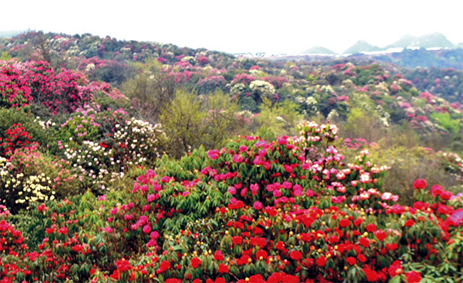 每年的3、4月份是杜鵑花盛開的時期,放眼望去,方圓百里滿山遍野綠花似雪球;有彩紅、淡紅、紫紅、淡紫、雪白等顏色,色彩斑爛,熱情似火。