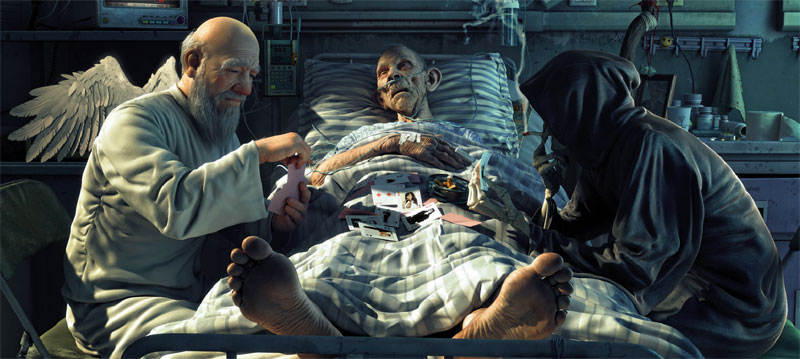 一個(gè)將死之人,在彌留之際,發(fā)現(xiàn)身邊坐著兩個(gè)人,魔鬼和天使。他們?cè)诖策呁媾?,并以牌局論輸贏,賭這個(gè)人的靈魂是飛到天堂,還是下到地獄。他緊張地看著牌局,不知道自己的命運(yùn)會(huì)怎樣。