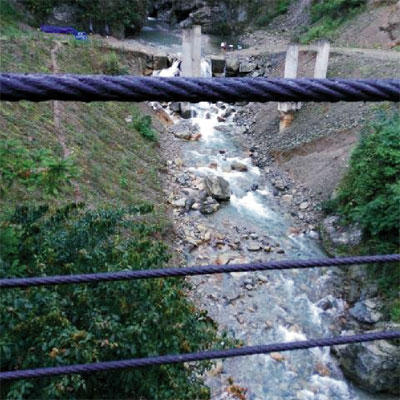 午飯之后是自由活動時間,我們兩車人決定去對面的大山中逛逛。一路穿過農(nóng)莊果園,竹林菜地。大路的盡頭在半山腰間的亭邊,我們只能下車徒步去欣賞更深層的美景。山間驟雨,并沒有澆滅我們的熱情。漫步在木棧竹徑,青翠片片,竹林清幽,溪水潺潺, 晶瑩剔透。清風(fēng)拂過竹林驚起溪水蕩漾,空氣中都能嗅到濕潤的泥土與清新的花香彌漫交融。憩息在亭臺軒榭,薄霧冥冥,暗香流動,煙雨蒙蒙,如詩如畫。細雨落在山間織起飄渺幕幔,山谷里都能聽到飄來的煙嵐與青翠的竹林清奏天籟。站著煙雨中的吊橋上,詩意而空靈。在這蒙蒙細雨之中我體味到純凈清幽的大自然。