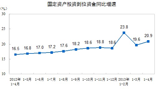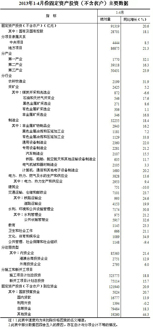 【導(dǎo)讀】2013年1-4月份,全國固定資產(chǎn)投資(不含農(nóng)戶)91319億元,同比名義增長20.6%,增速比1-3月份回落0.3個百分點。從環(huán)比看,4月份固定資產(chǎn)投資(不含農(nóng)戶)增長1.63%。