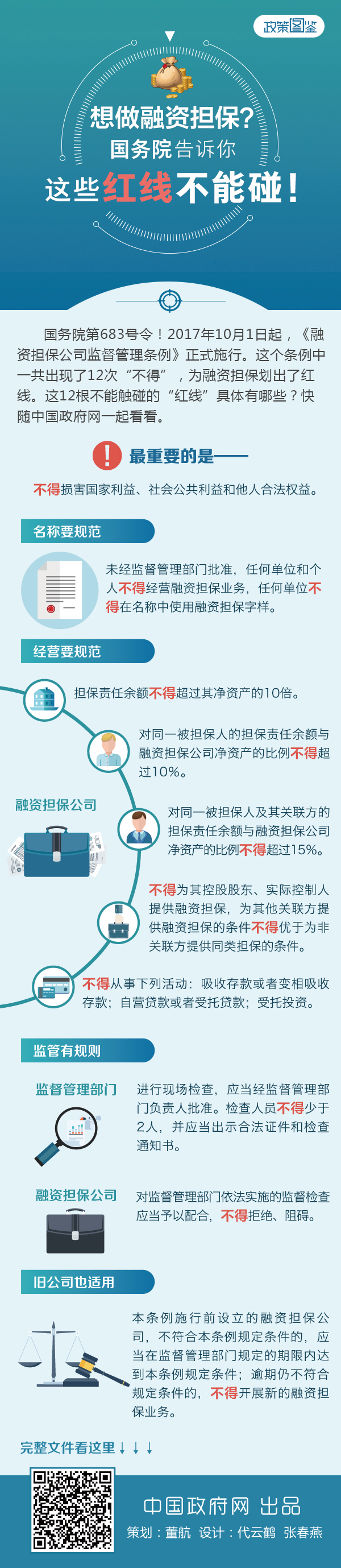 【導(dǎo)讀】國務(wù)院第683號令!2017年10月1日起,《融資擔(dān)保公司監(jiān)督管理條例》正式施行。這個條例中一共出現(xiàn)了12次“不得”,為融資擔(dān)保劃出了紅線。這12根不能觸碰的“紅線”具體有哪些?快隨中國政府網(wǎng)一起看看。